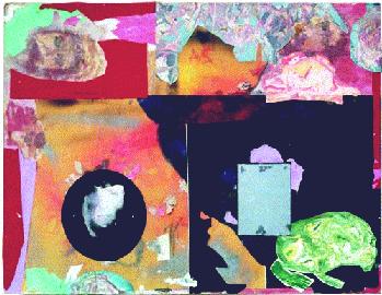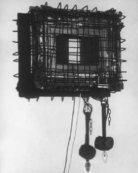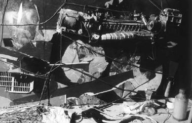 Altorjai Sándor Sugármeghajtású koporsó, kék leopárddal, színes rongy képében, részlet A kép befejezetlen maradt, azonban a mûvész pontos utasításai alapján a hiányzó részletek kivitelezhetõek voltak (Egy rugóra erõsített üvegmadarat ventillátor lebegtet; egy rejtett hangszóróból A.S. hangja szavalja Erdély Miklós Rejtett paraméterek c. versét, stb.)
